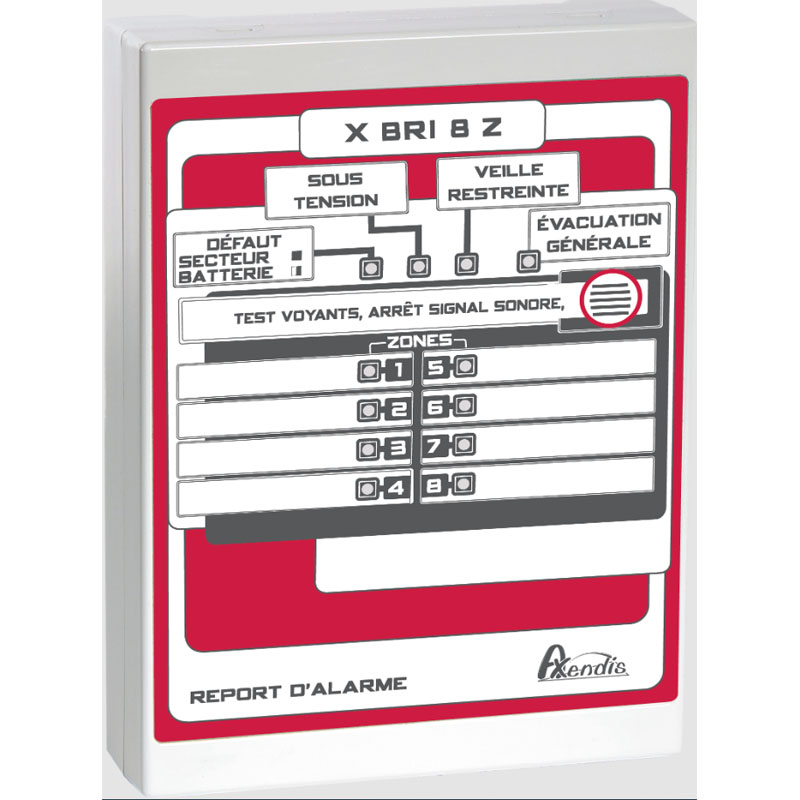 Les boîtiers de report d’alarme incendie 4 zones (10530) et 8 zones (10590) permettent de recevoir à distance la signalisation visuelle et sonore des informations en provenance des blocs autonomes d’alarme sonore principaux de marque Axendis : BAAS PR4, 4 Zones 11551 et BAAS PR8, 8 Zones 11561. Le raccordement des boîtiers est réalisé par BUS de communication. Chaque boîtier intègre une pile de 9V qui permet de donner une information de dérangement en cas de coupure de la liaison avec le bloc autonome d’alarme sonore principal.